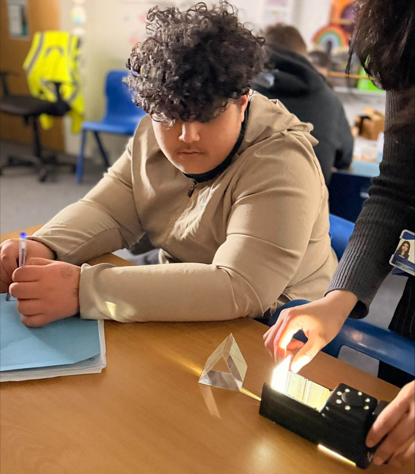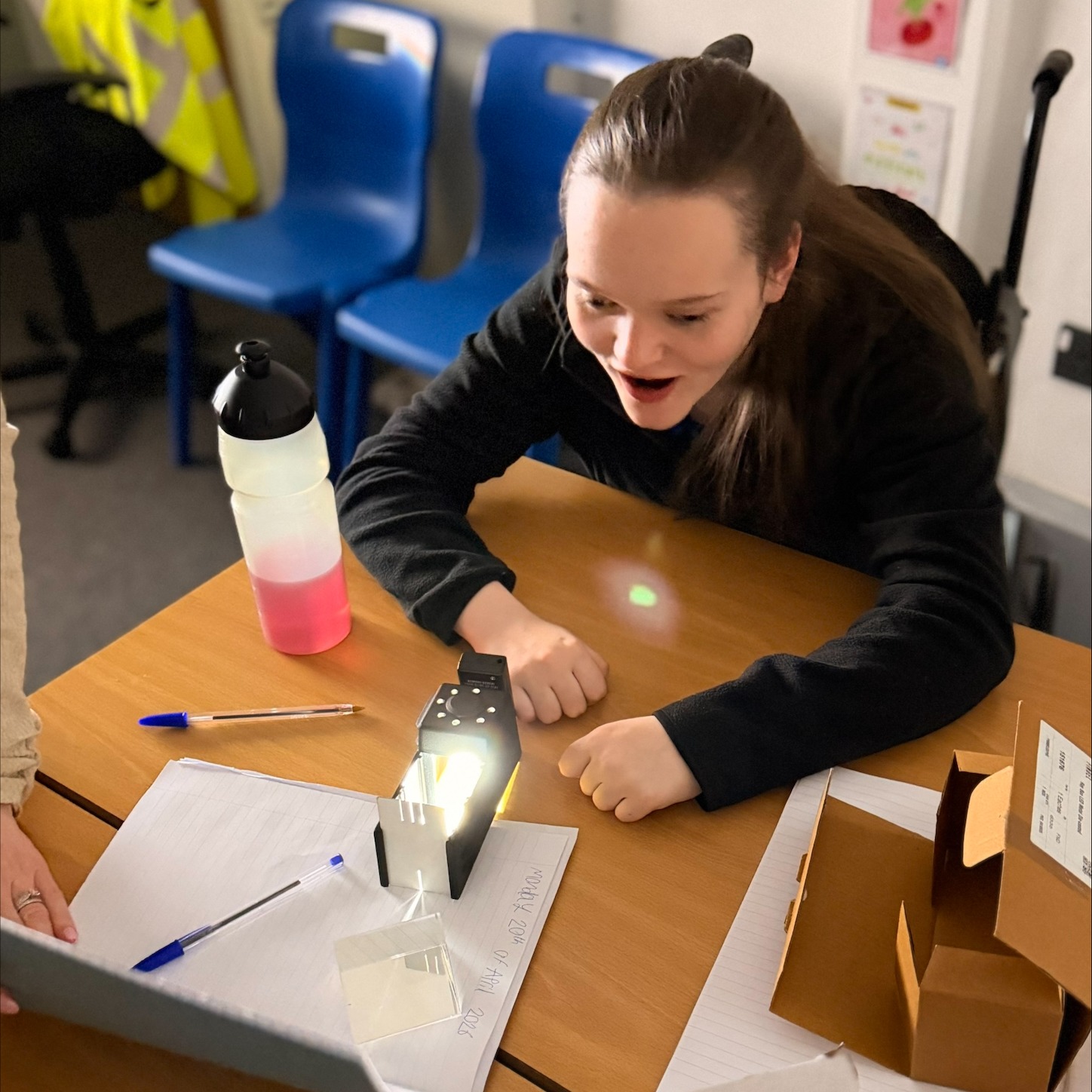 Students have used glass blocks to view the bending of light. They’ve also investigated what happens when light passes through a glass prism to create their very own ‘indoor’ rainbows!
